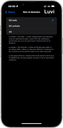 • 5G activée : Utilisation constante de la 5G dès qu’elle est disponible (peut réduire l’autonomie).