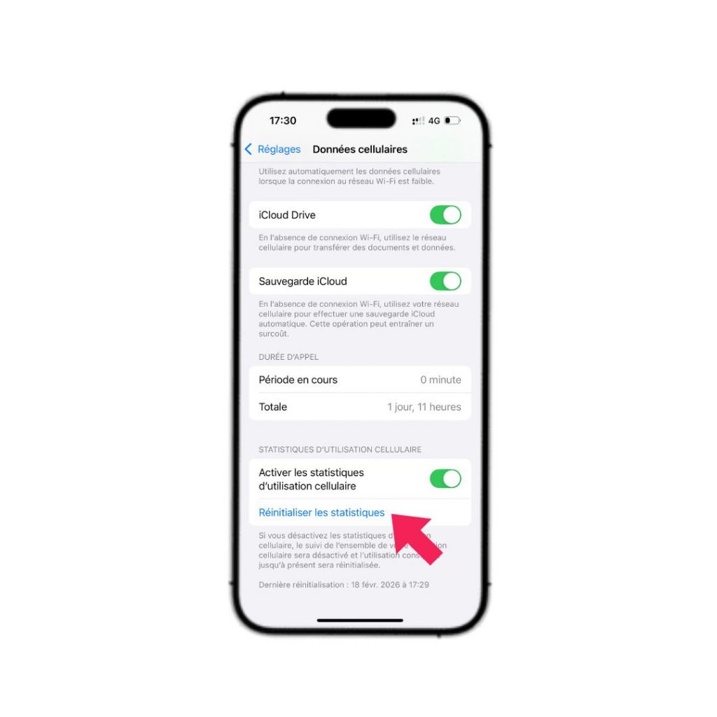 En bas de la page, touchez Réinitialiser les statistiques le jour où commence votre cycle (début de mois / date de facturation).